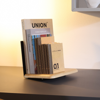 棚板にスチール製のブックエンドを取り付けた、本を立てて置ける積読用スタンド。デスクや床上など置き場所を選ばず本を立てて置けるので背表紙が見やすく、取り出しやすいのが特長です。積まれた本が読まれて本棚に収まるまでの「こしかけ」の役割を果たします。