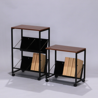 天板付き2段型のファイルワゴン。天板は資料を広げるだけでなく、スマートフォンや観葉植物などのちょい置きスペースとしても活躍。書類を出し入れしやすく、収納時も倒れにくい傾斜付きの棚に、キャスター付きで便利。カラーはシックなブラック×ダークブラウン。