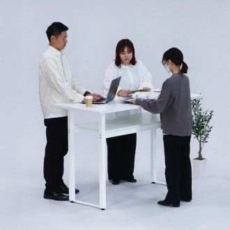 オフィスやラウンジにぴったりなハイテーブル。高さ100cmで立位のミーティングやハイチェアでの作業が快適に行えます。荷物棚や配線孔付きで、全周に人が集まりやすく、社内のコミュニケーションを促進。シンプルなデザインはどんな空間にも調和し、打ち合わせや休憩、軽食など多目的に活用できます。